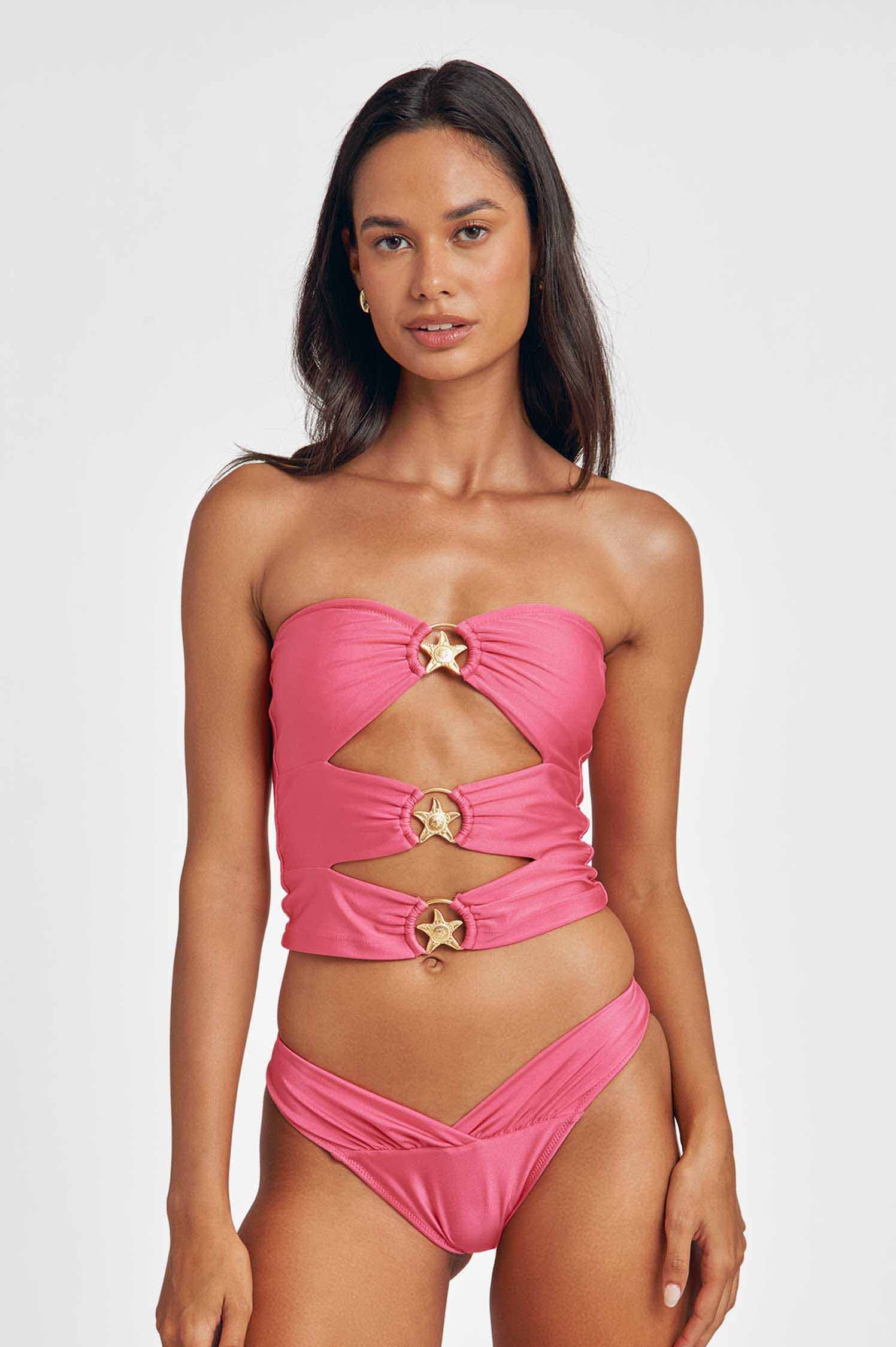 This one’s for the beach babes. The Dosia top features alluring cut-out details, highlighted by custom centerfront hardware that elevate any look to a ten. Whether you’re at a poolside party or having the best beach day, this top’s got you covered. Pair with matching bottoms for a snatched fit.