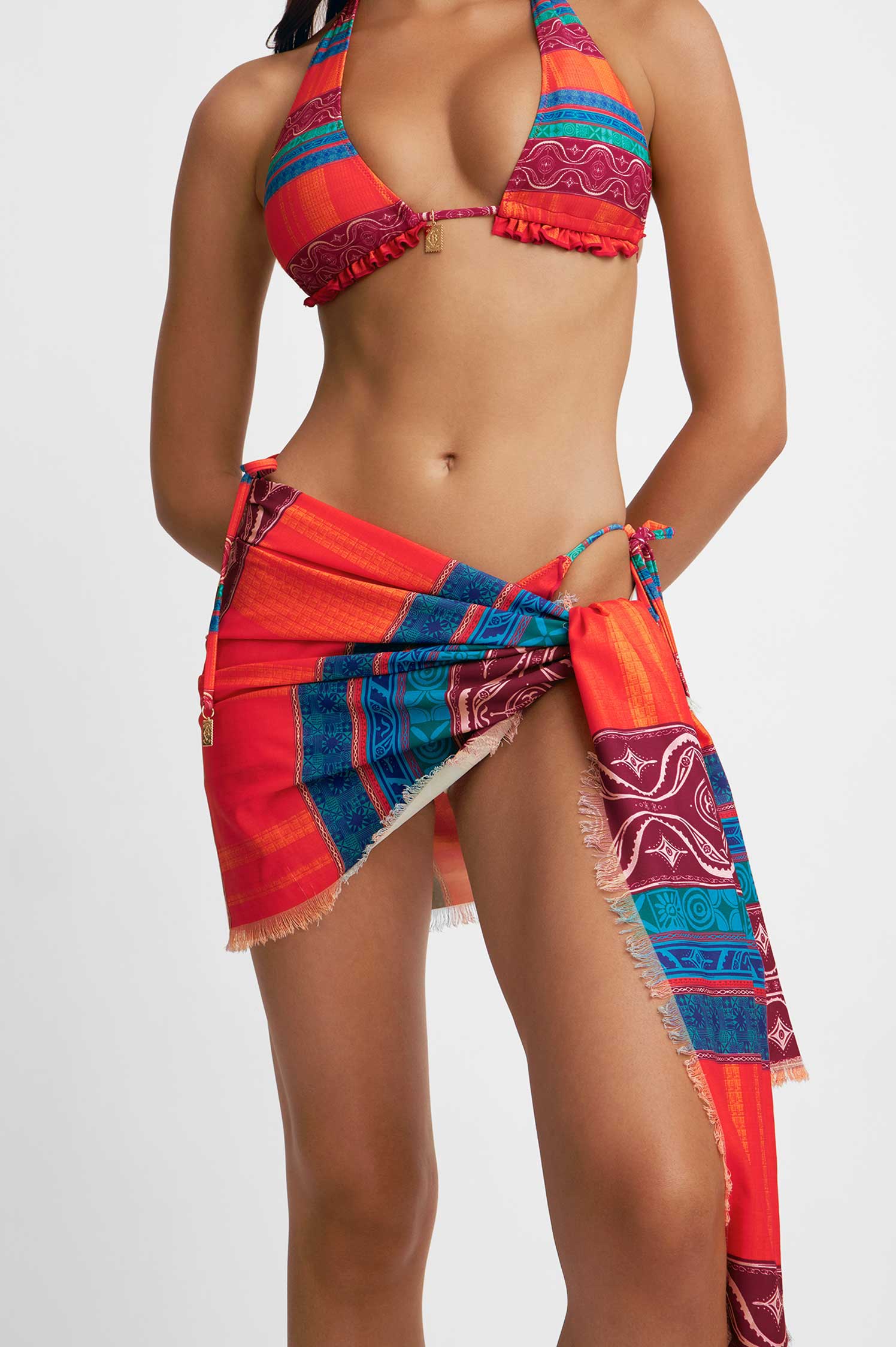 Transition from lounging at the beach to a casual lunch with the Keisha sarong. Designed with versatility in mind, this classic piece can be tied around the waist or worn as a scarf. It’s made with lightweight, airy fabric and trimmed with a raw frayed edge hem, to add volume and elegance to any look.