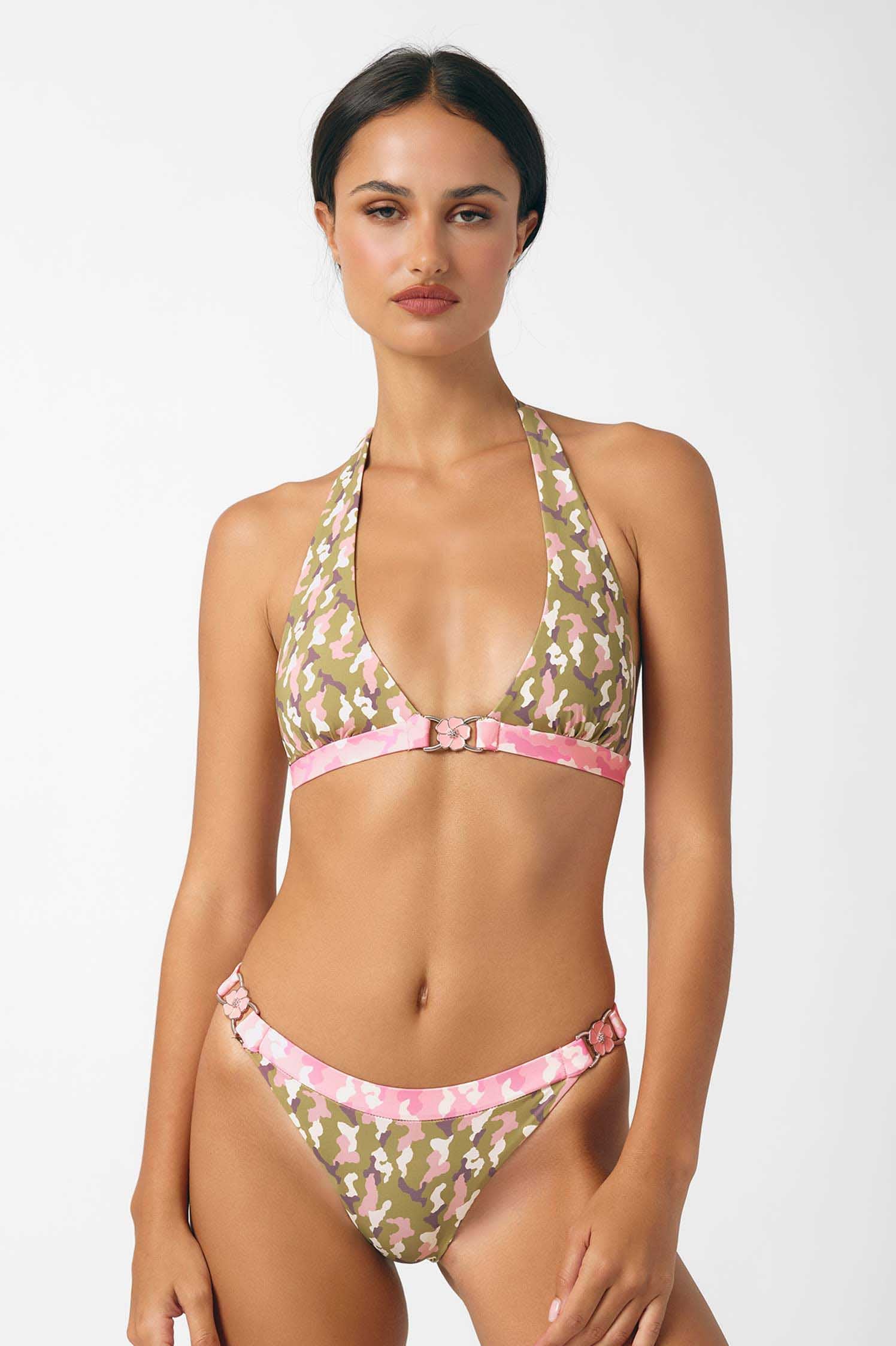 Flirty and fierce– the Kiana® Top brings the drama with its bold halter cut, standout accent band, and a gorgeous floral center front charm. Tie it on, turn heads, and channel your inner doll. Match it up with the Monica bottoms or mix it up—either way, you’ll be an absolute icon.