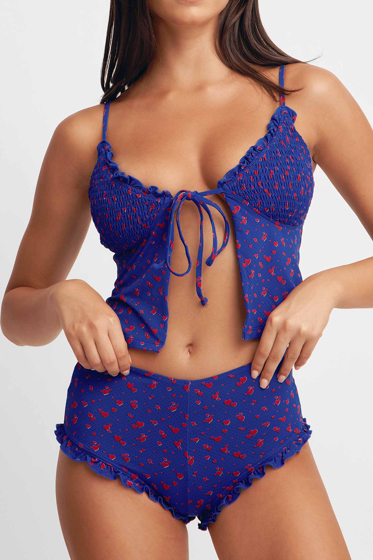 As dainty as can be, say hello to the Louise tankini. With its delicate ruffle details and cute front tie, this top is the perfect flirty addition to your wardrobe. Wear with its matching bottoms and your best accessories for an extra flattering look.