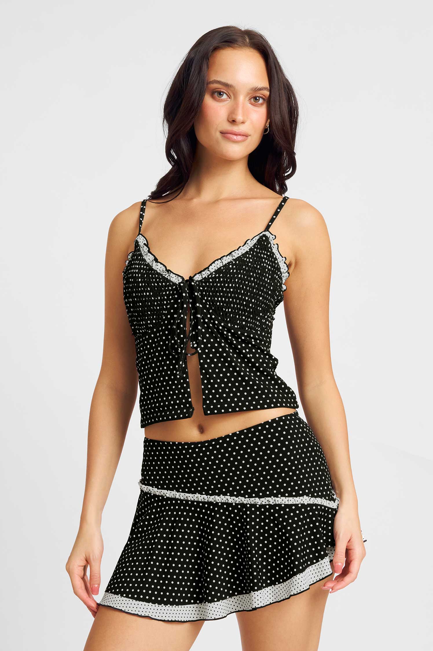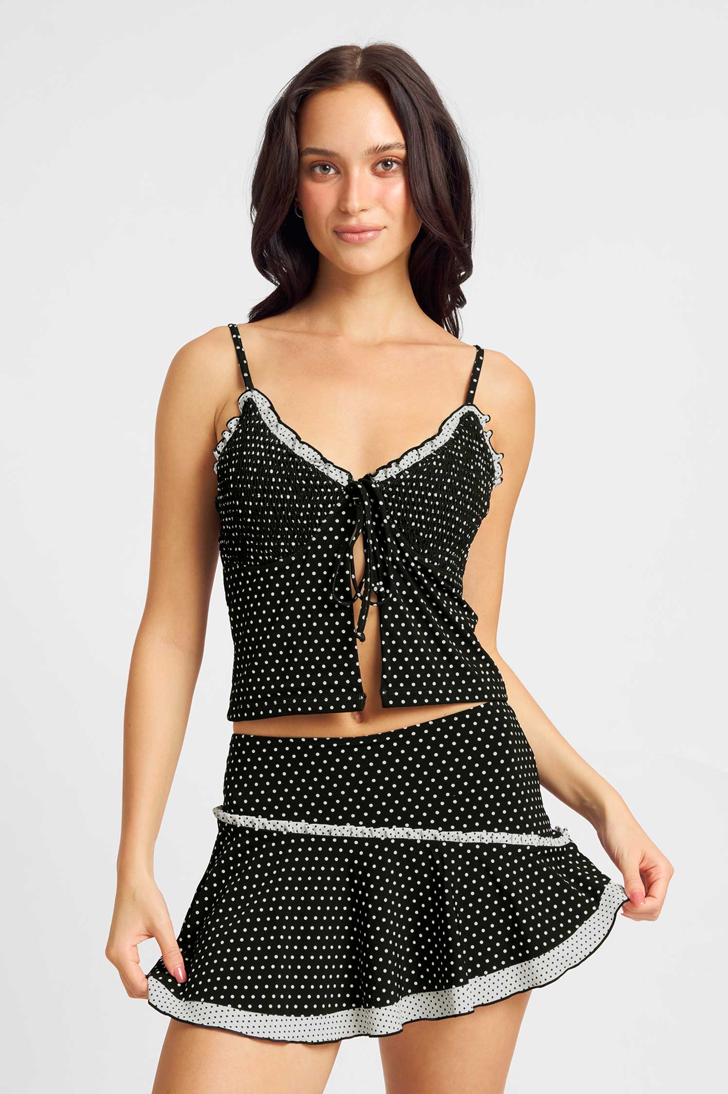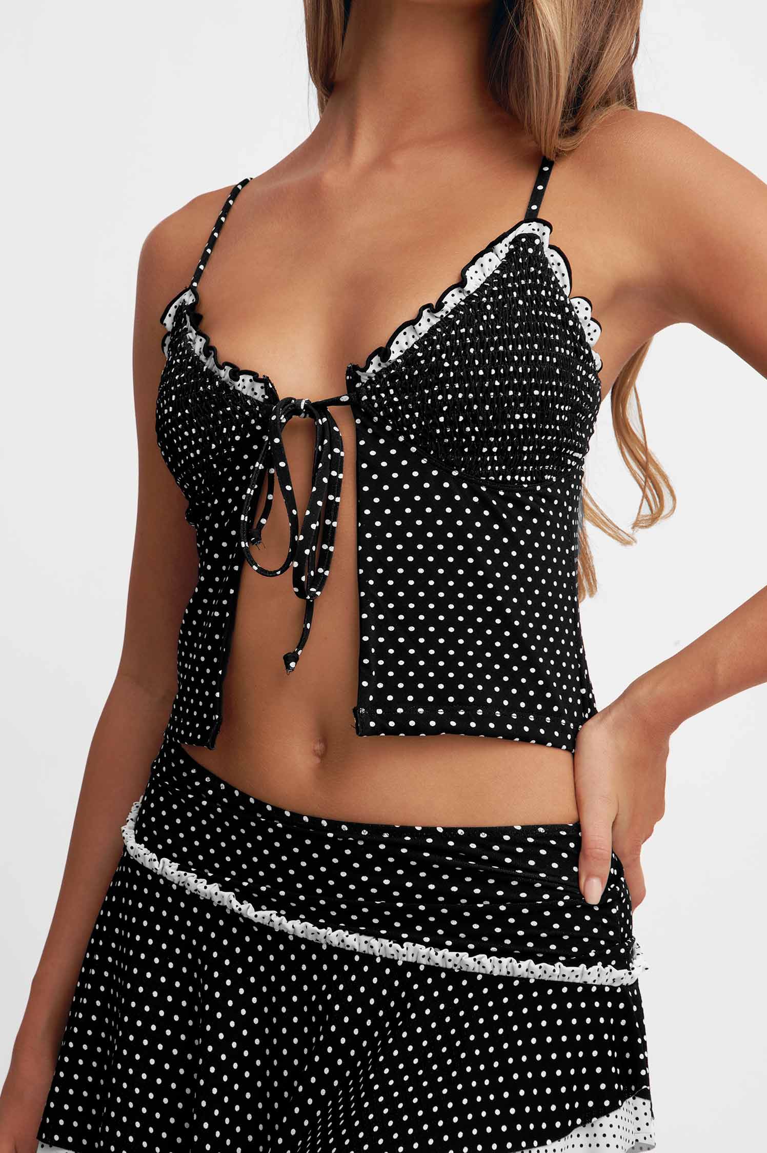 As dainty as can be, say hello to the Louise tankini. With its delicate ruffle details and cute front tie, this top is the perfect flirty addition to your wardrobe. Wear with its matching bottoms and your best accessories for an extra flattering look.