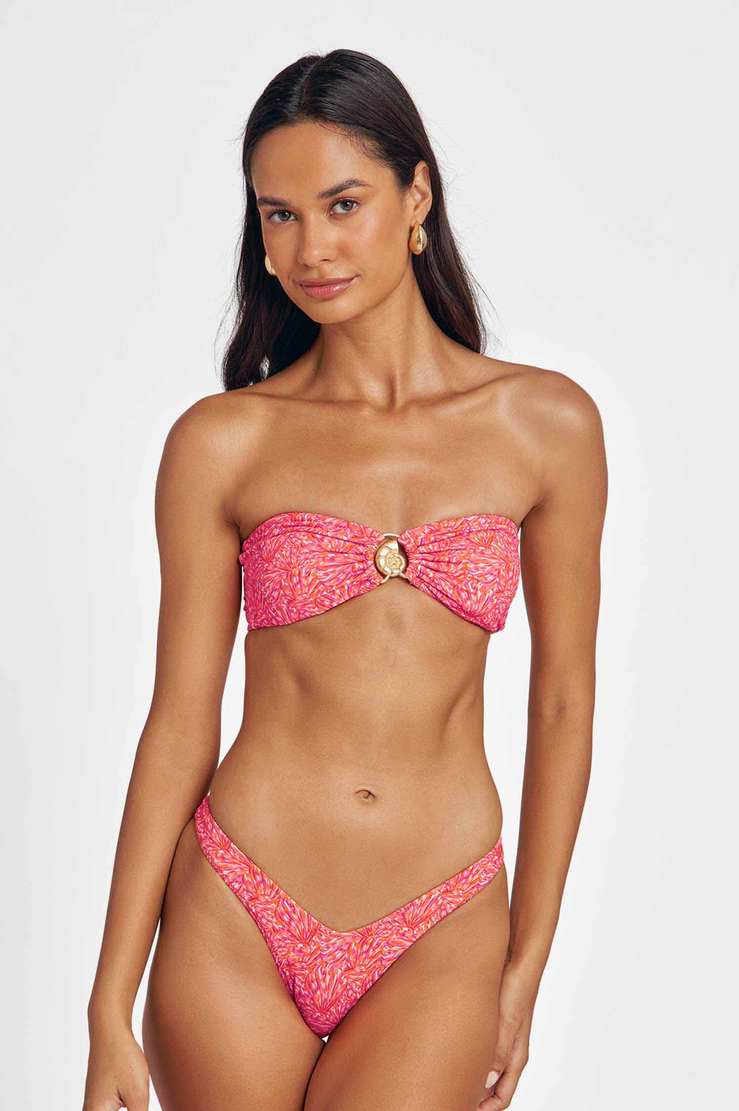 Release your inner mermaid with the Shelby top, featuring a stunning custom shell hardware ring for a bold beach look. Perfect for your next adventure, this fun bandeau top will have you feeling like a sea goddess. Wear with the matching bottoms for a complete beach-ready look that's sure to make waves.